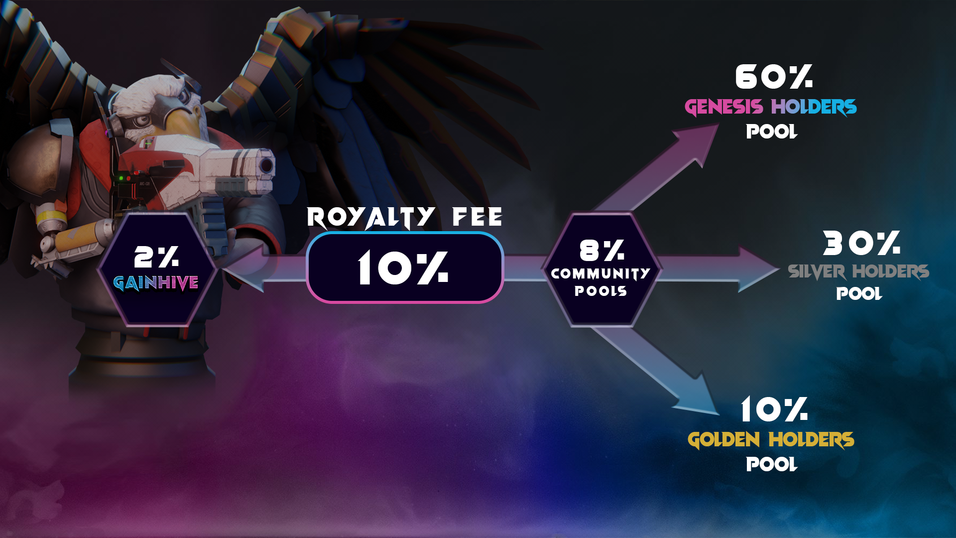 Three different royalty revenue pools have been created for Early Adapter NFTs: Genesis Pool, Silver Pool, and Golden Pool. These pools will be filled daily with 55% of the royalties from daily trading on the Marketplace and will be distributed to NFT stakeholders every 15 days, with the following distribution: Genesis Pool - 60%, Silver Pool - 30%, and Golden Pool - 10%.